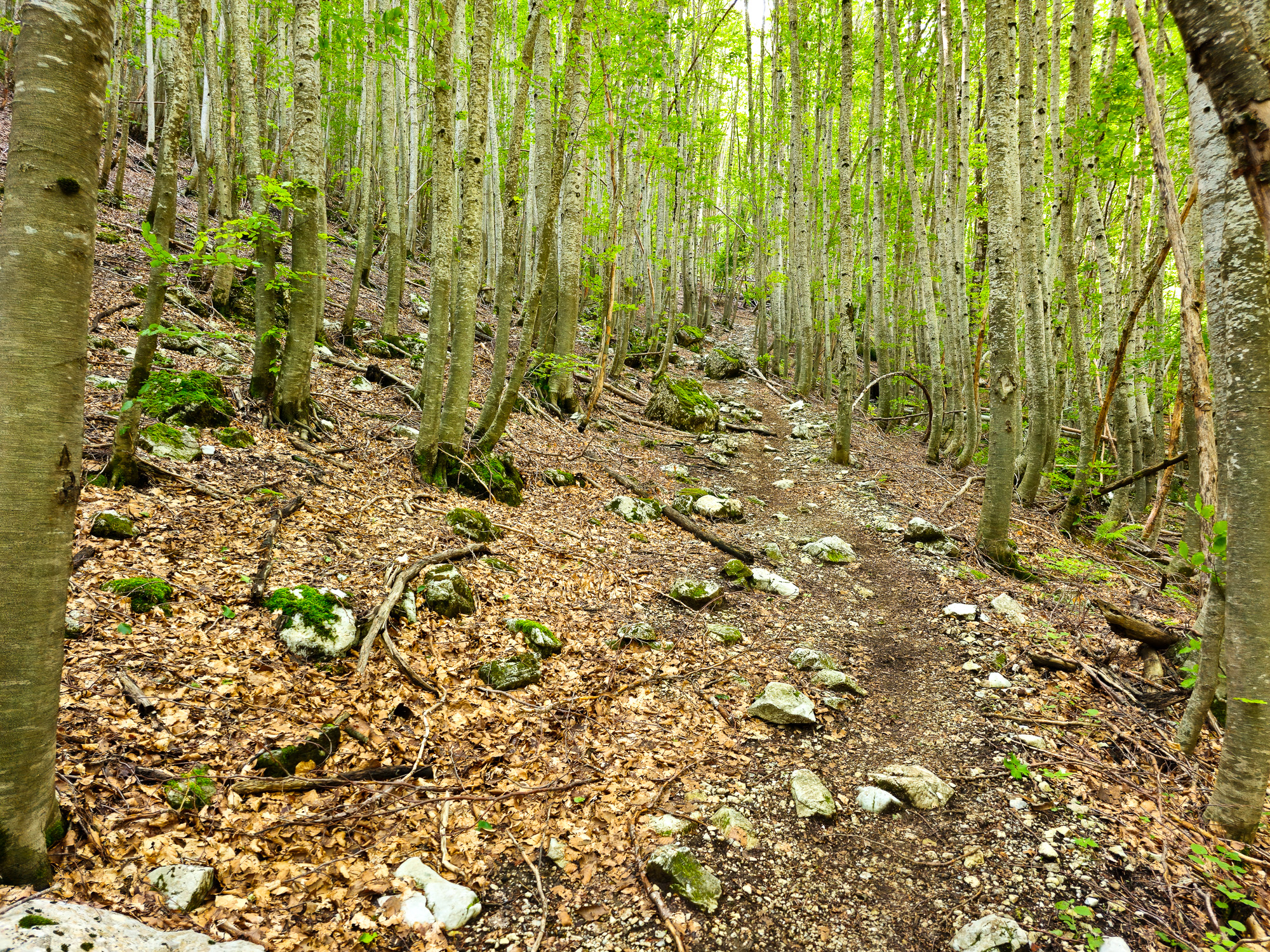 Dann geht es bergauf, denn wir haben den Aufstieg gestern unterbrochen. Wir wandern lange durch den Wald, mal mit steilen, dann wieder ebeneren Abschnitten.