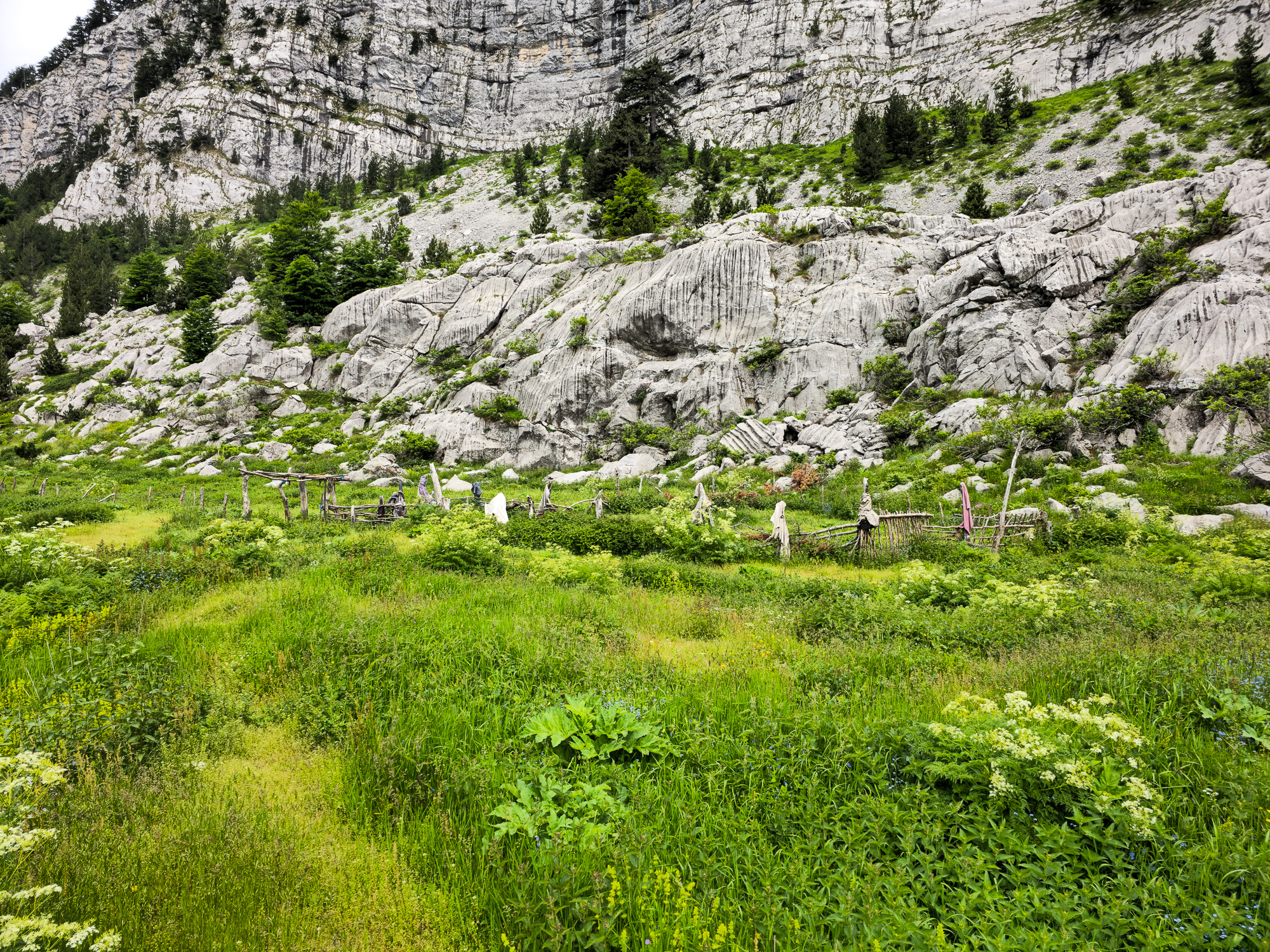 Es wirkt wie ein angelegter Park, umringt von hohen Bergen. Grüne Wiesen, gelegentlich keine Nadelbäume – einfach herrlich. Als hätte jemand einen perfekten Campingplatz hier eingerichtet. Nur das Wasser fehlt leider und wir wollen weiter, obwohl wir uns da gerade nicht ganz sicher sind. Am hinteren Ende der Wieso entdecken wir Ruinen von einfachen Häusern.