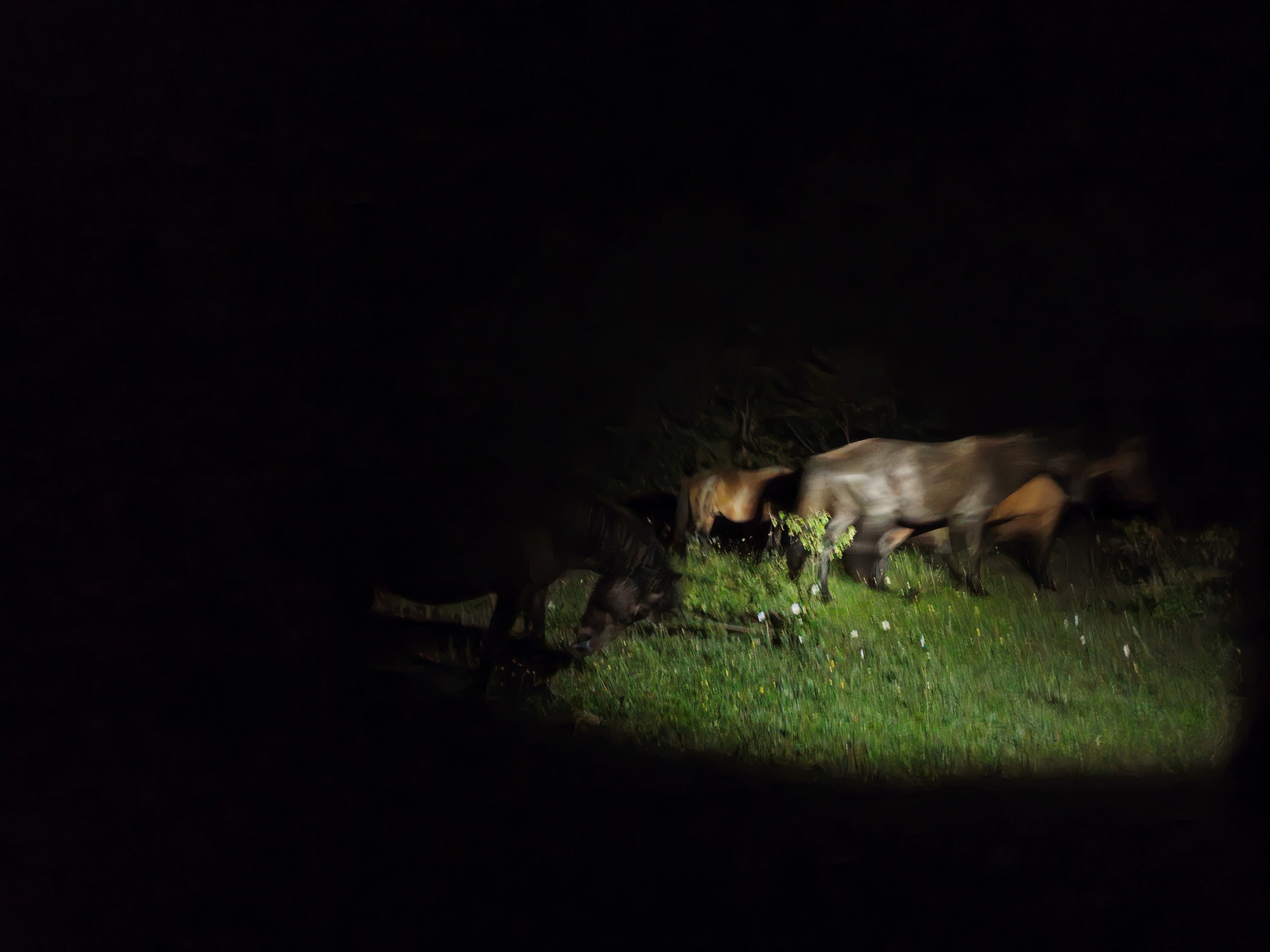 Stefan geht direkt raus, mein Puls explodiert und ich packe in Windeseile die noch im Zelt liegenden Teile ein, während Stefan die Tiere im Blick behält und die Heringe aus dem Boden zieht. In kürzester Zeit haben wir alles gepackt. Wir schreien erneut durch die Nacht, dieses Mal aber als Warnung. Bjorn aus Colorado und Alex aus Schweden, so viel wissen wir inzwischen, schlafen ein Stück weiter die Wiese runter und dorthin macht sich die Pferdemeute gerade auf den Weg, nachdem es bei uns nichts mehr zu holen gibt.