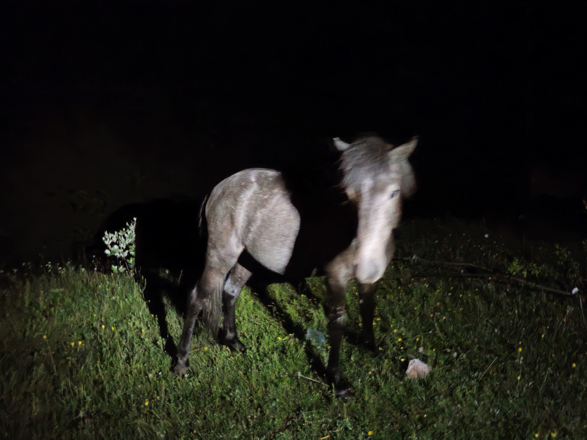 Zu viert gehen wir ein Stück bergauf und über einen kleinen Pfad durch ein Waldstück auf eine Lichtung. Wir sind ziemlich fertig und bedanken uns etliche Male. Hier campieren die zwei und nachdem wir den Schock ein klitzekleines bisschen verdaut haben, bauen wir unser Zelt erneut auf und machen Inventur. Es fehlen diverse Heringe, aber irgendwie steht das Zelt für den Moment. Wie durch ein Wunder ist nichts ernsthaft beschädigt und auch sonst haben wir bis auf Kleinigkeiten keine Verluste. Alles riecht intensiv nach Pferd, aber damit müssen wir wohl erstmal leben. Und jetzt? An Schlaf ist nicht zu denken, doch loswandern können wir auch nicht. Es ist stockdunkel und der Weg führt über einen Berggrat. Wir fiebern der Dämmerung entgegen. Ich bin dafür, dass wir wenigstens ein paar Minuten schlafen, damit wir den Anstieg und Abstieg vom Berg schaffen. Stefan steht noch komplett unter Schock und traut der Situation nicht. Wir packen all unsere Sachen in unsere Rucksäcke und lassen nur eine Matte und die Schlafsäcke als Decken draußen. Falls die Pferde erneut kommen sollten, können wir in kürzester Zeit flüchten.