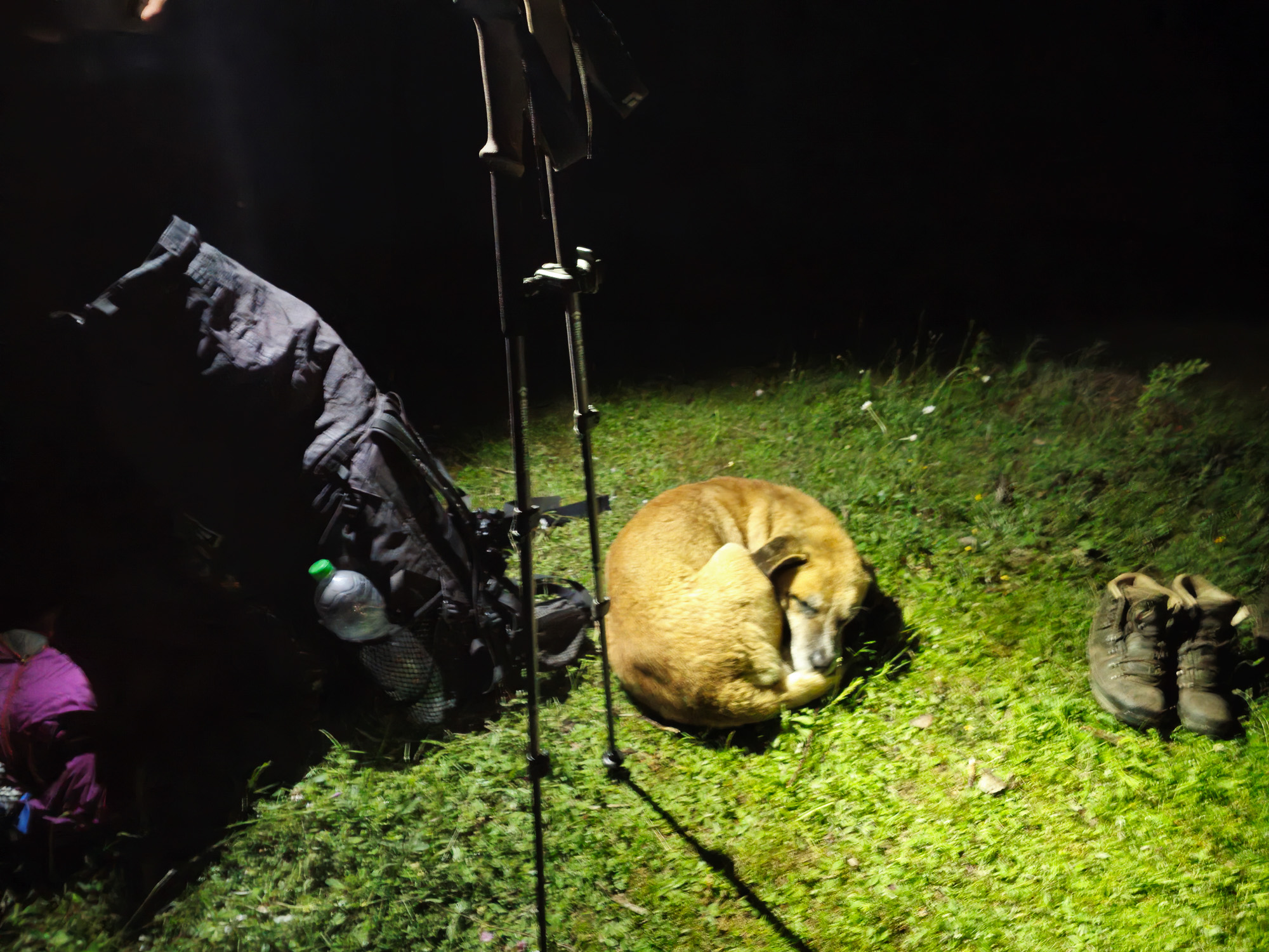 Als wir ein Drittel des Abstiegs geschafft haben, machen wir auf einem Stück Wiese Pause. Wir dösen ein bisschen in der Sonne. Die Müdigkeit kommt durchaus durch. Dann reißt Stefan mich lauthals aus meinem Dämmerschlaf. Ich schrecke hoch und befürchte die nächste Katastrophe, doch da sitzt plötzlich „nur“ wieder der Hund neben uns. Huch, wo kommst du denn her?? Kurz darauf folgen Alex und Bjorn, die den Hund wohl unterwegs von uns übernommen haben. Wir spekulieren, dass wir fünf nach der letzten Nacht nun wohl ein Rudel bilden. Die zwei gehen weiter, wir drei bleiben noch kurz zurück.