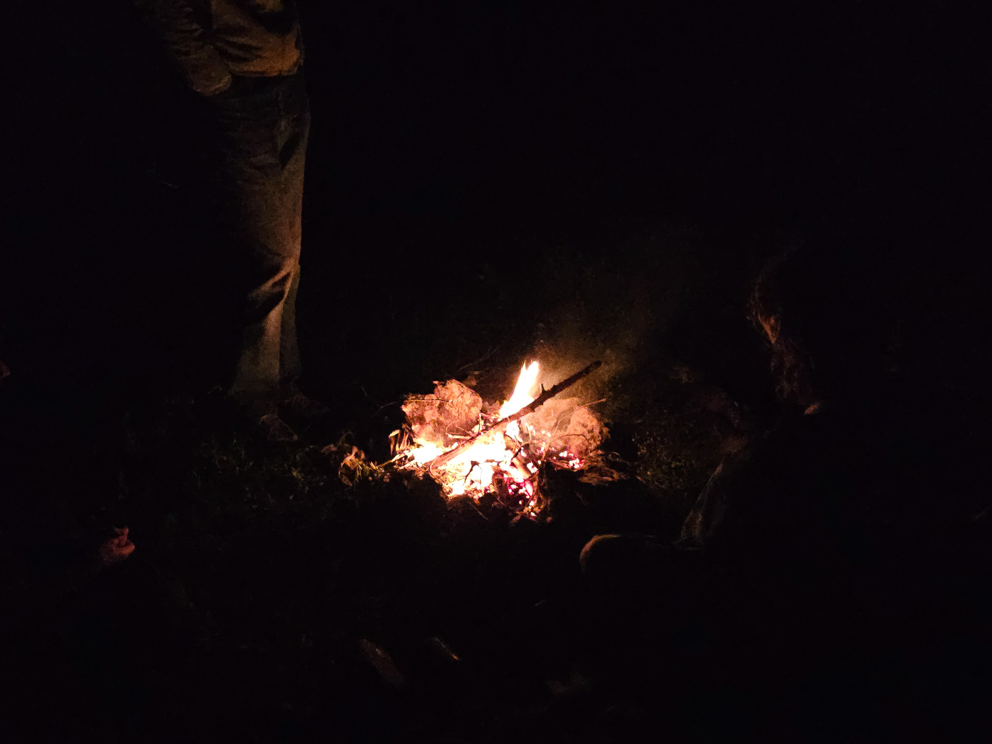 Dann stehen wir zu viert zusammen und versuchen, ein Lagerfeuer in Gang zu kriegen, um die Tiere zumindest jetzt von uns und unserem Gepäck abzuhalten.